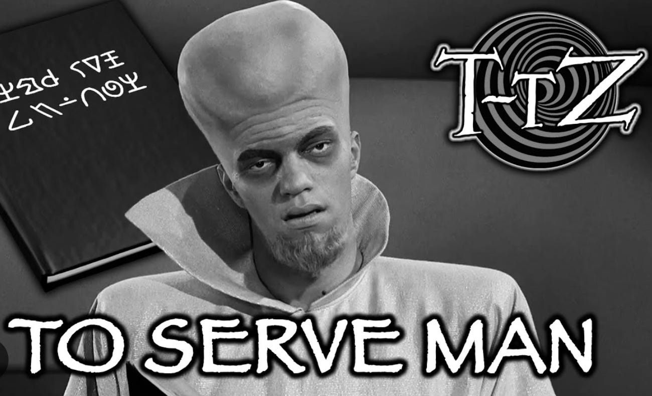 I suspect that many, possibly most people reading this piece are too young to have had the experience of having their minds blown by the ABC network series The Twilight Zone, the show that transformed television in the 1960s the way Twin Peaks did in the 90s. The 24th episode of the show’s third season was entitled To Serve Man. No one who’s seen it will ever forget it. A nine-foot tall representative from a highly advanced alien species arrives on Earth and addresses the U.N., offering the human race the technology that will end hunger, war, and disease, and turn deserts into gardens. (These are, by the way, the same promises being made for AGI) Inviting mankind to visit his planet to see the proof of his claims, he departs, leaving behind a copy of his civilization’s founding document, an oversized book written in his almost indecipherable cuneiform, and a fleet of ships ready to ferry humans to his paradisal planet. Throughout the episode, we see humanity gradually won over by the Utopian offer and beginning to board spaceships for what may be a very extended visit, while in the background, the U.N. decryption expert makes increasingly frantic efforts to translate the holy text, certain that there must be a message of great spiritual importance. At the very last minute, as a large group, including her erstwhile colleague and lover, are getting ready to board, she breaks through the crowd at the dock and screams, “I did the translation! To Serve Man…it’s a cookbook!”